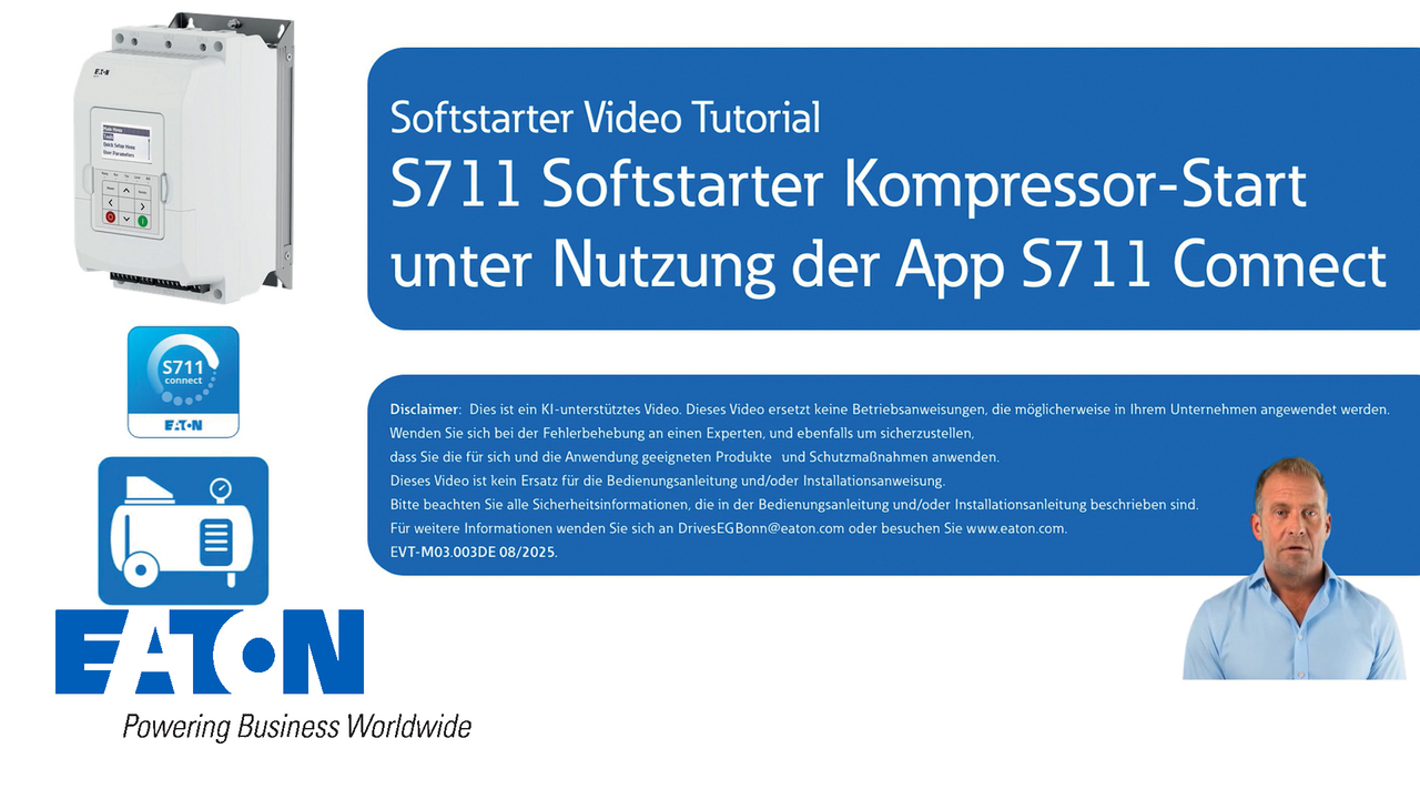 Dieses Tutorial zeigt, wie man mit Hilfe der App S711 Connect den S711 Softstarter für einen Kompressor mit den typischen Parametern konfiguriert. Außerdem werden zusätzliche Features für den Betrieb eines Kompressors gezeigt.